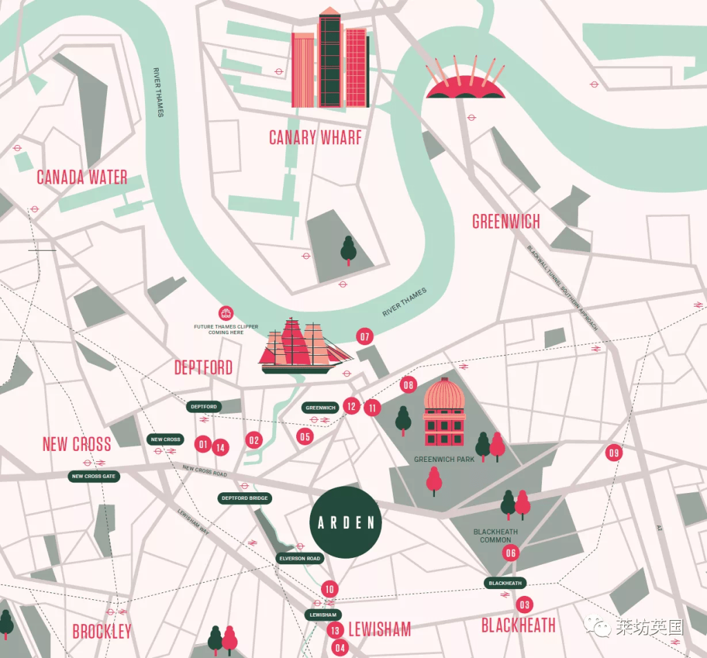由上图我们可以看出,Arden距离格林威治公园(Greenwich Park)和绿地面积占地数英亩的布莱克希思(Blackheath Common)均在步行时间范围内。周边几大社区包括Deptford, Levisham,New Cross和Brockley。