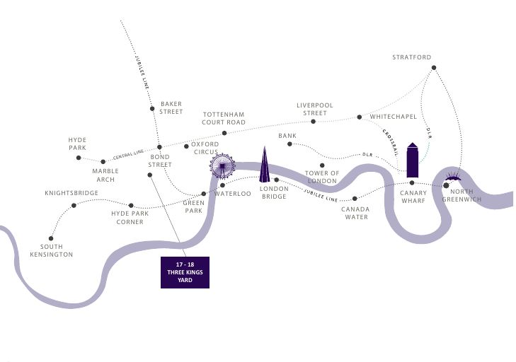 国王巷3号周边交通四通八达,横跨Underground五大线:Bakerloo, Central, Jubilee, Piccadilly, 和 Victoria,周围最近的邦德街(Bond Street)地铁站只需三分钟步行即可到达。2022年上半年开通的Crossrail又将大大提高该地的交通环境,届时只要27分钟就可以从邦德街到伦敦希思罗(Heathrow)国际机场。