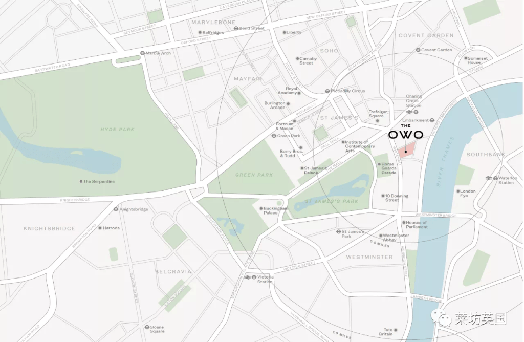 The OWO最初由英国建筑师 William Young 和他的儿子 Clyde 设计,并于 1906 年完工。坐落于原白厅宫的遗址之上,The OWO可以欣赏到圣詹姆斯公园、白金汉宫、唐宁街10号、大本钟的美景,这里曾是亨利八世及多个君主的住所,在20世纪英国军事历史上,尤其是第一、第二次世界大战中,扮演着举足轻重的地位。