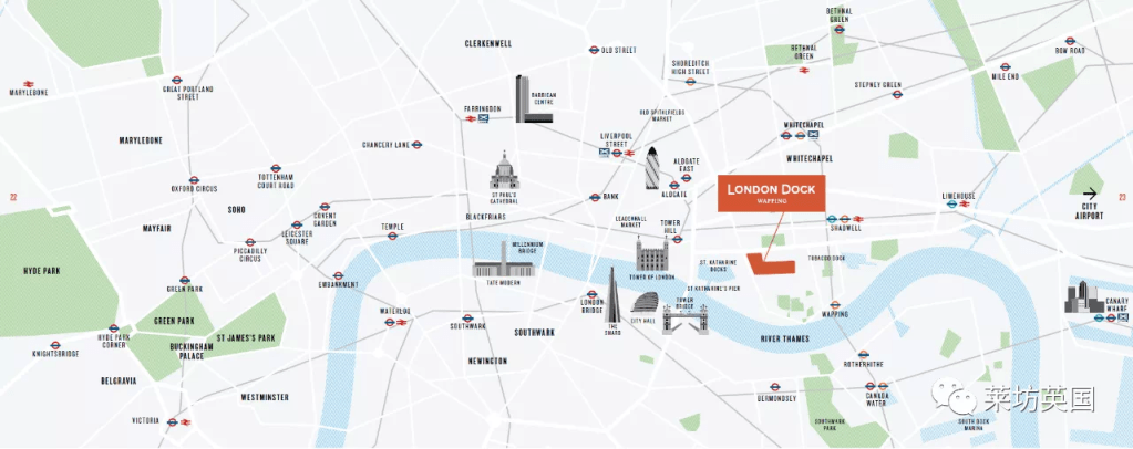 伦敦码头London Dock所在区域内交通发达,DLR Line道克兰轻轨、District Line区线、Circle Line环线在附近交汇,项目东边还有East London Line东伦敦线经过。从项目出发不仅可以直达老金融城Bank银行(站)和新金融城金丝雀码头,也能够轻松抵达象征伦敦传统文化和生活的西伦敦。