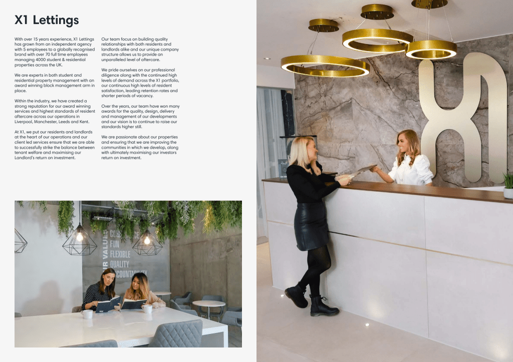· X1除住宅开发项目外, 还经营着一家屡获殊荣的出租和管理公司X1 Lettings,提供全面的管理服务。通过 X1 Lettings 管理的 4,000 多个单位拥有 98% 的平均入住率。