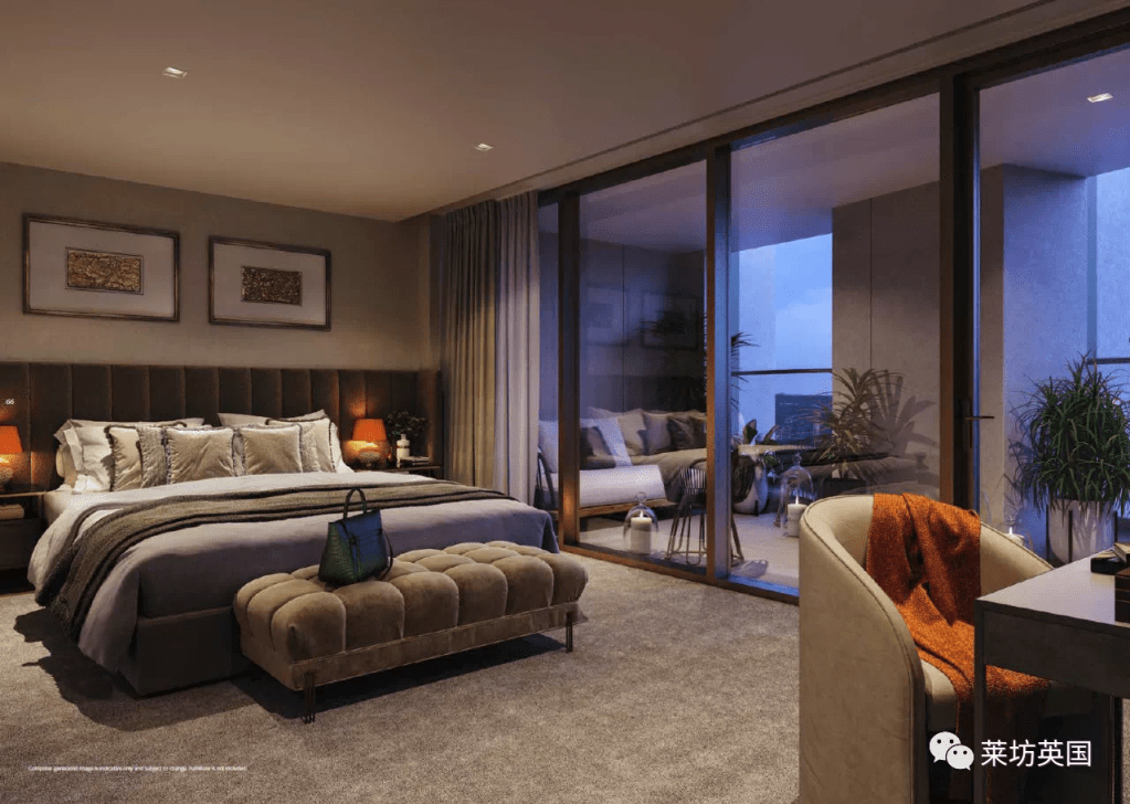 主卧的设计同样格调满满,墙面的设计布满了线条装饰,深浅交错,令人感觉舒适放松。主卧的旁边是一个相当大的景观阳台,可以远眺浪漫的伦敦夜景。