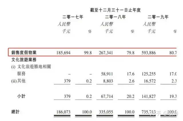 2017年至2019年期间,中国文旅分别收入1.86亿元、3.35亿元、7.36亿元,其中销售度假物业的营收比例较大,期内占比为99.8%、79.8%、80.7%。